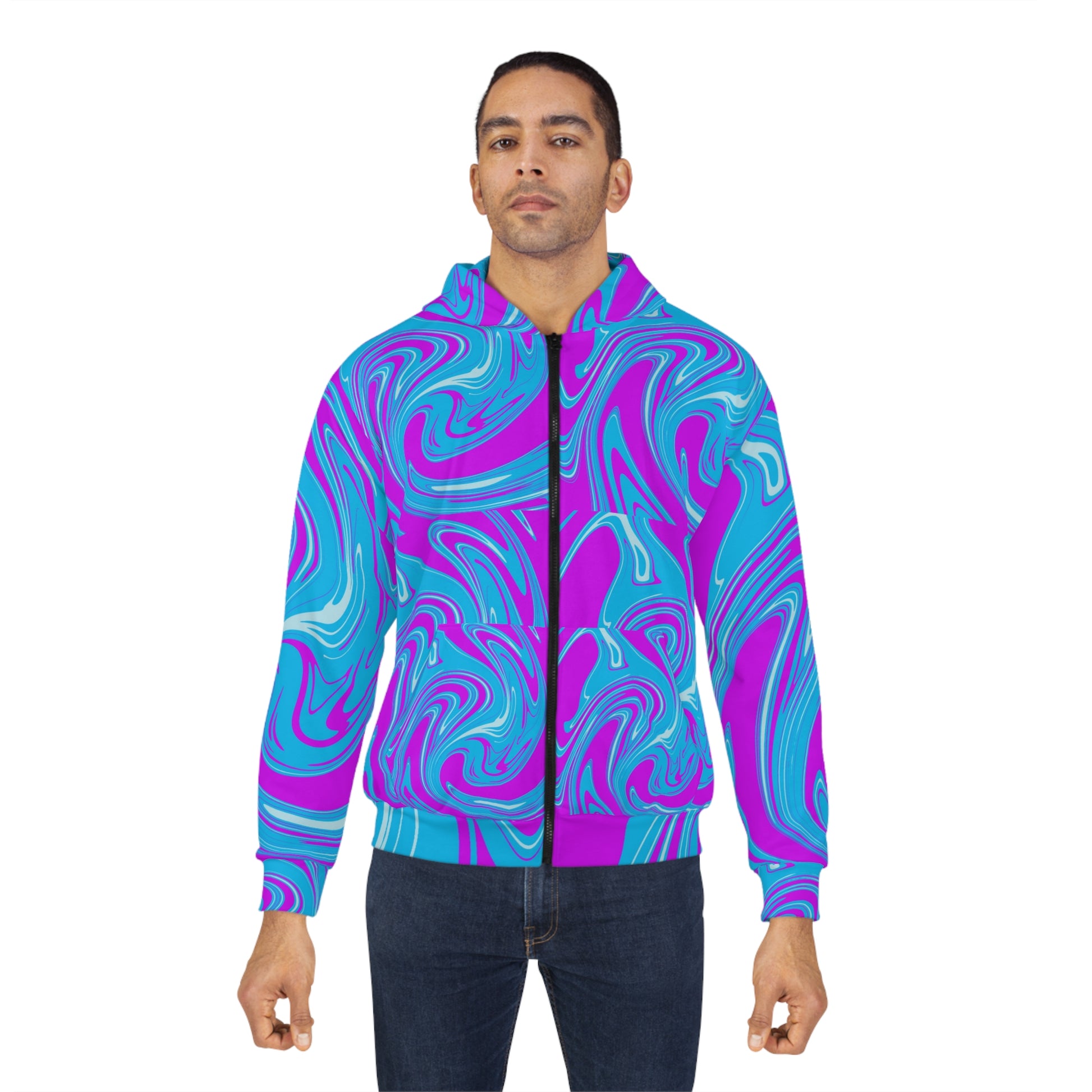 This zipped jacket will keep you nice and toasty through the cold. It’s a great all-over print zip hoodie that is easy to customize without fear of visible white lines at the seams. It has a large front pocket, black zipper, a roomy hood and is custom cut and sewn. It’s your perfect pick this winter.